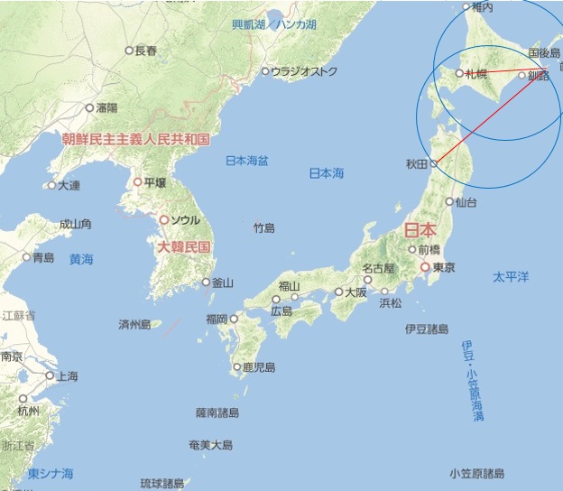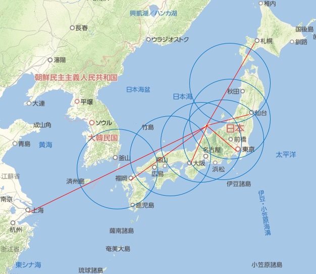 ・予測震源域は半径300kmで、Magnitude=6.0の地震を想定している。M < 6.0であれば小さく、M > 6.0であれば大きくなる